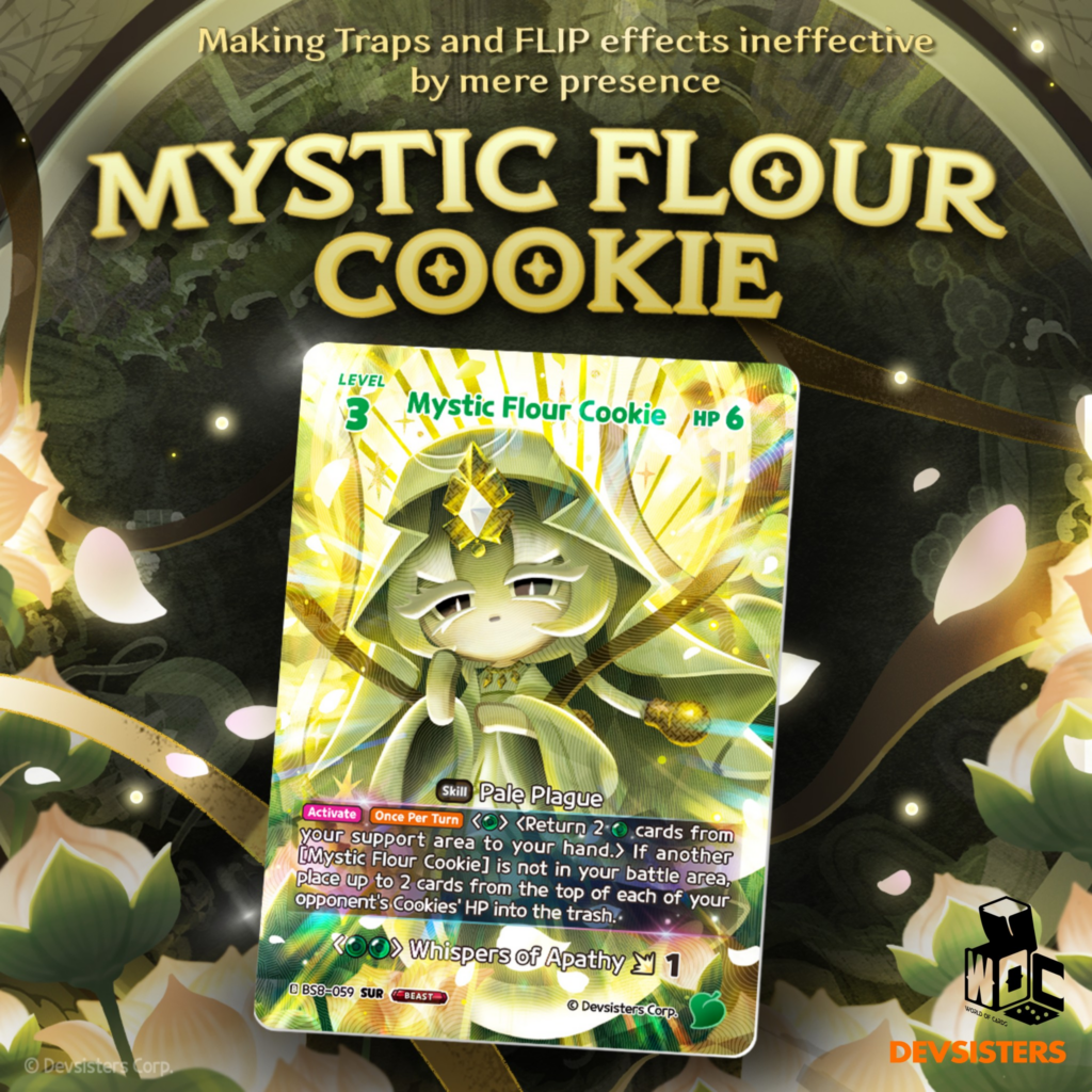 One powerful Green card introduced in this expansion is bs8-059-mystic-flour-cookie. Her skill, Pale Plague, lets you return two cards from your support area to your hand once per turn. can directly reduce opposing cookies' HP by 2 directly - bypassing any Item or Trap cards that reduces damage. Both bs8-072-soul-jam-light-of-apathy and bs8-052-cloud-haetae-cookie further supports Mystic Flour Cookie by ensuring her survivability and replenishing your Support Area.