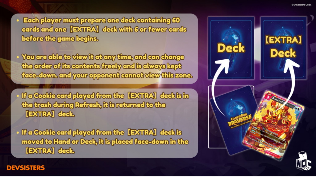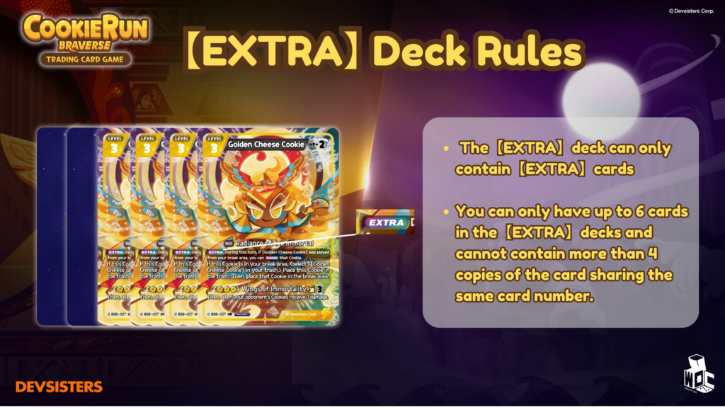 The Extra Deck functions as a separate game zone that differs completely from the main 60-card deck. Players prepare this zone with six or fewer cards, which means every slot must carry significant value. Only Extra Cookie Cards and Awakened Cookie Cards are eligible for this deck, and the standard four-copy limit still applies. The zone can't be seen/peeked (you know what I mean) to the opponent, yet fully accessible to the player, creating strong opportunities for planning and adjustment during play.