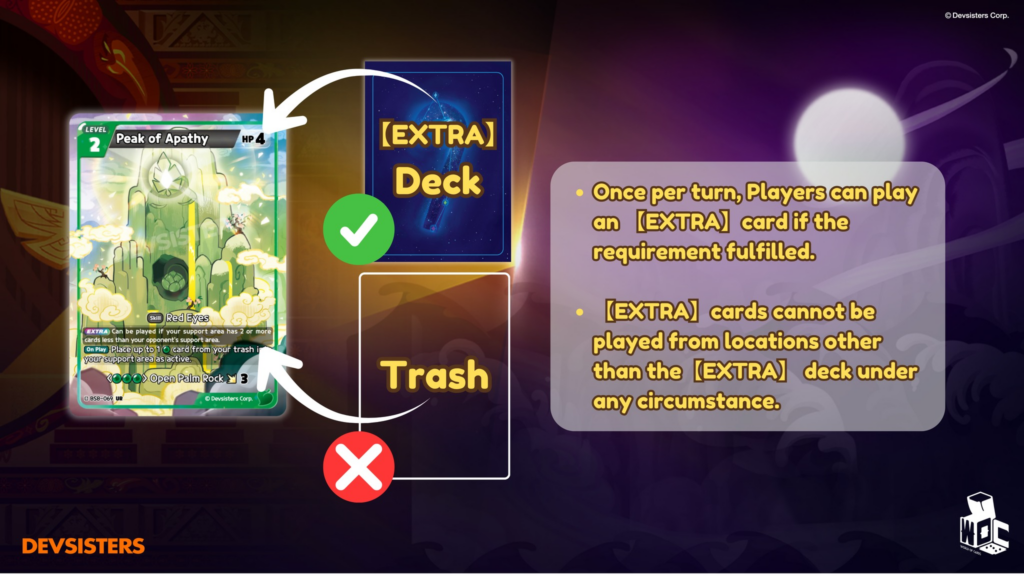 This restriction affects many interactions. If an item card attempts to return an Extra Cookie from the battle area to the hand, the card bypasses the hand entirely and returns to the Extra Deck. The same rule applies when stage cards attempt similar movements or when trap cards try to shuffle Extra Cards back into the deck. Even during a deck refresh, Extra Cards automatically leave the trash pile and return to the Extra Deck before shuffling occurs.