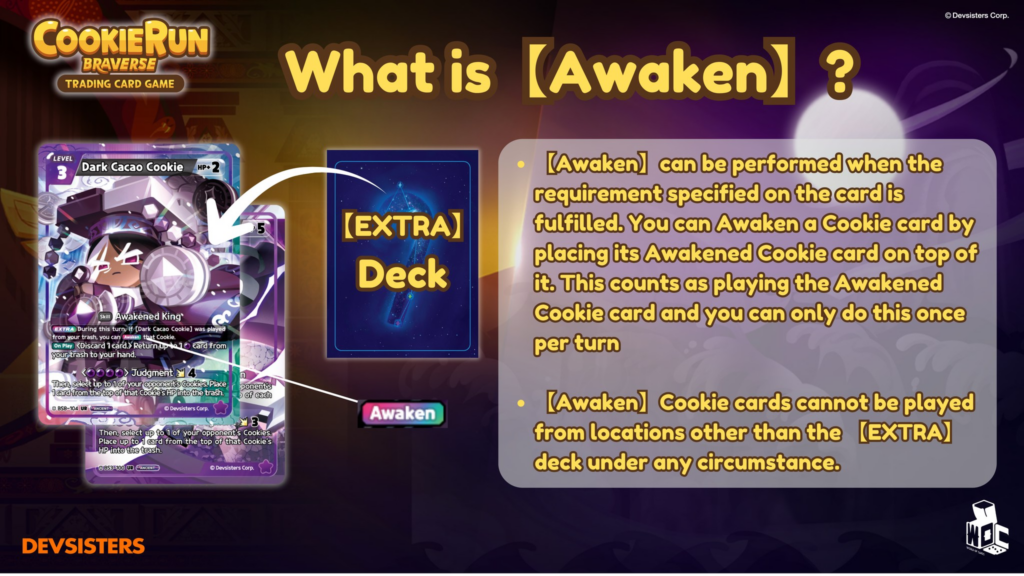 The Awaken System adds even more strategic depth. Playing an awakened card on a rested cookie immediately activates it in active mode. This restores the cookie, allowing it to attack or defend instantly, providing a significant tempo advantage. However, costs still apply: players must meet normal play requirements, making these cards powerful yet resource-intensive.