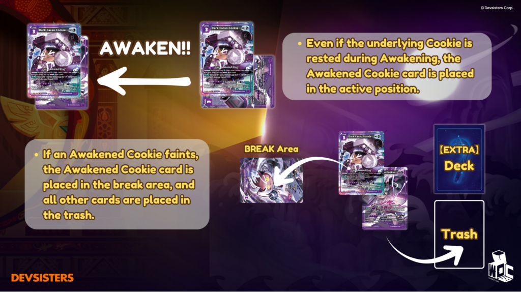 Extra Deck cards may only move freely between public zones such as the support area, battle area, trash, or break area. This exception enables strategic counterplay because forcing an opponent’s powerful Extra Cookie into the support area can limit its impact. However, when an Awakened Cookie faints, the risk becomes severe. The Awakened card moves to the break area while its attached cards move to the trash. Each card in the break area contributes to the LV total that causes defeat at Break Area Level-10 .